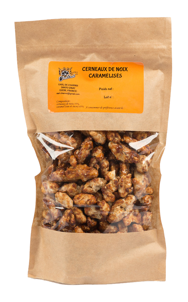 Nos noix caramélisées sont vendues en sachet de 200gr, la farine en sachet de 150gr et le miel toutes fleurs en pot de 500gr